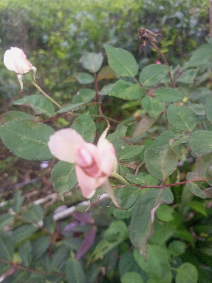 The scene depicts a close-up view of a rose bush located in the city of Zee Pin Kone, Myanmar. A primary subject, a partially unfurled light pink rosebud, is prominently featured in sharp focus in the foreground, exhibiting a deeper pink interior. To the upper left, a second, smaller, and less defined pink rosebud is visible, remaining out of focus. The rose bush itself features numerous ovate green leaves, some displaying reddish stems and slight reddish-brown discoloration along their edges. In the upper right portion of the image, a single dried, brown flower head is present on a thin stem. The background consists of dense, blurred green foliage and indistinct brown ground cover, indicative of an outdoor garden or natural setting. No individuals or active subjects are present.