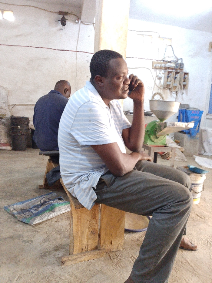 The scene is set indoors in Olomoda, Nigeria, within what appears to be a processing or workshop environment. Two adult males are present. In the foreground, a dark-skinned male, wearing a light blue and white striped short-sleeve polo shirt and dark gray trousers, sits on a rudimentary wooden bench. He is actively holding a dark-colored mobile phone to his right ear, engaged in a conversation. His left arm is bent, with his hand resting on his left thigh. He wears dark sandals. Behind him and slightly to the left, a second dark-skinned male, bald and wearing a dark blue short-sleeve shirt, sits facing away from the camera on a similar wooden bench. The background consists of light-colored, possibly off-white, walls displaying visible wear and exposed electrical wiring. Multiple white electrical boxes and switches are mounted on the wall in the mid-ground. To the right, a green and silver machine, identifiable as a grinder or mill with a funnel-shaped hopper, rests on a small wooden table. A blue plastic container is positioned behind this machine, and a white bucket with a handle is on the floor nearby. On the left side of the image, several black buckets are stacked, and white sacks are partially visible. The floor is made of concrete, and a blue and white woven mat or bag lies on it near the foreground male's feet.
