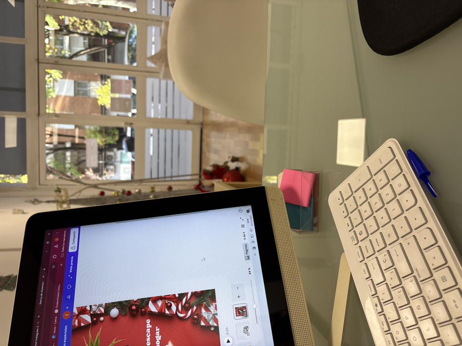 The image depicts an interior office or commercial space in Córdoba, Spain, viewed from behind a desk. In the foreground, a light-colored computer monitor displays a Christmas-themed design being edited in Canva, with visible browser tabs referencing "Iberca de Aislamien..." and "OcasionCasa | Inmo...", both indicative of businesses in Córdoba. The monitor's taskbar shows the date as December 22, 2021, and the time as 10:40. A white wireless keyboard rests on a glass-top desk, with a blue pen positioned on it. Adjacent to the monitor, a clear container holds pink and teal sticky notes. A black mouse pad is partially visible on the right. In the midground, a light-colored office chair is partially visible behind the desk. To the left, a stylized Christmas tree adorned with red and silver baubles stands on a wooden floor, next to a white-framed glass double door with frosted horizontal stripes on its lower panels. A small red decorative figure is visible on the floor near the tree. The background, visible through the clear upper panels of the glass door, shows an urban street scene with brick buildings, green trees, and a parked car across the street.