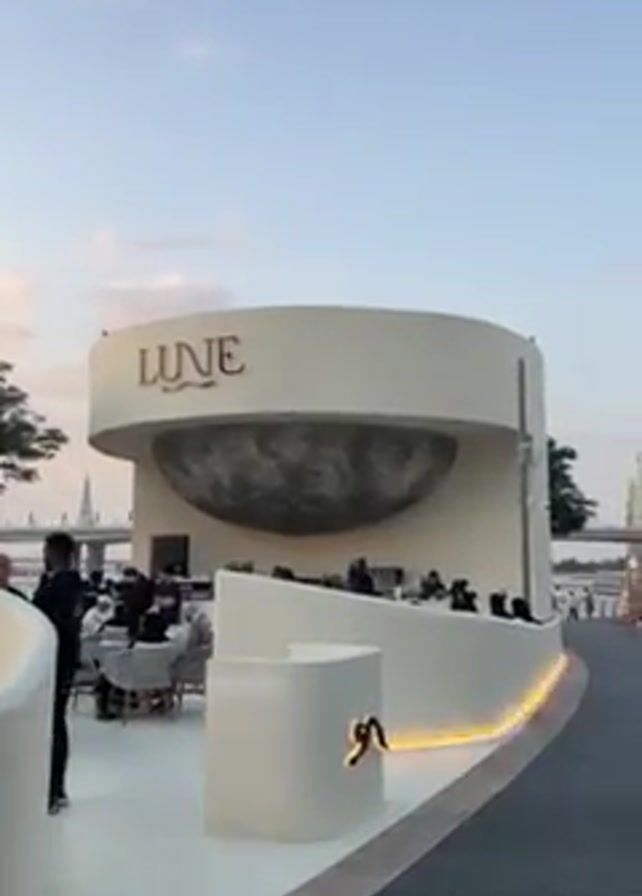 n outdoor area with a modern-looking restaurant or cafe called "Lune". The structure is white and round, with a half-moon or crater-like feature on the front. People are sitting at tables and being served. A walkway is nearby, with people strolling along it. The sky is blue with scattered clouds. In the distance, there are modern buildings, suggesting an urban setting. A couple walks past the camera.