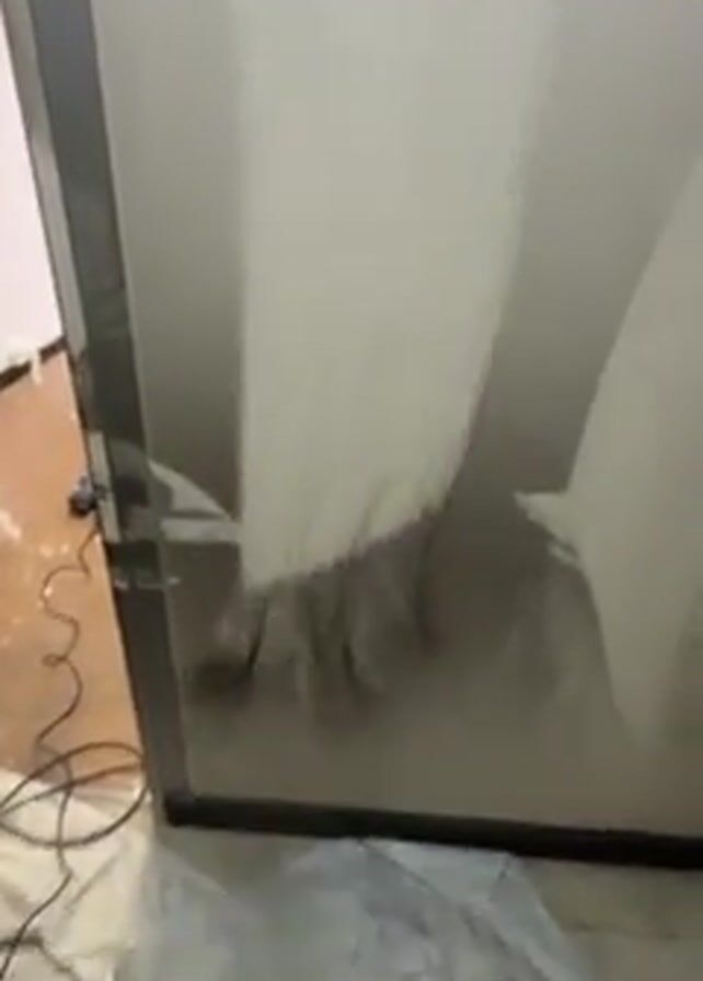 A person in a protective glove uses a broom to brush a wall, leaving dark streaks
