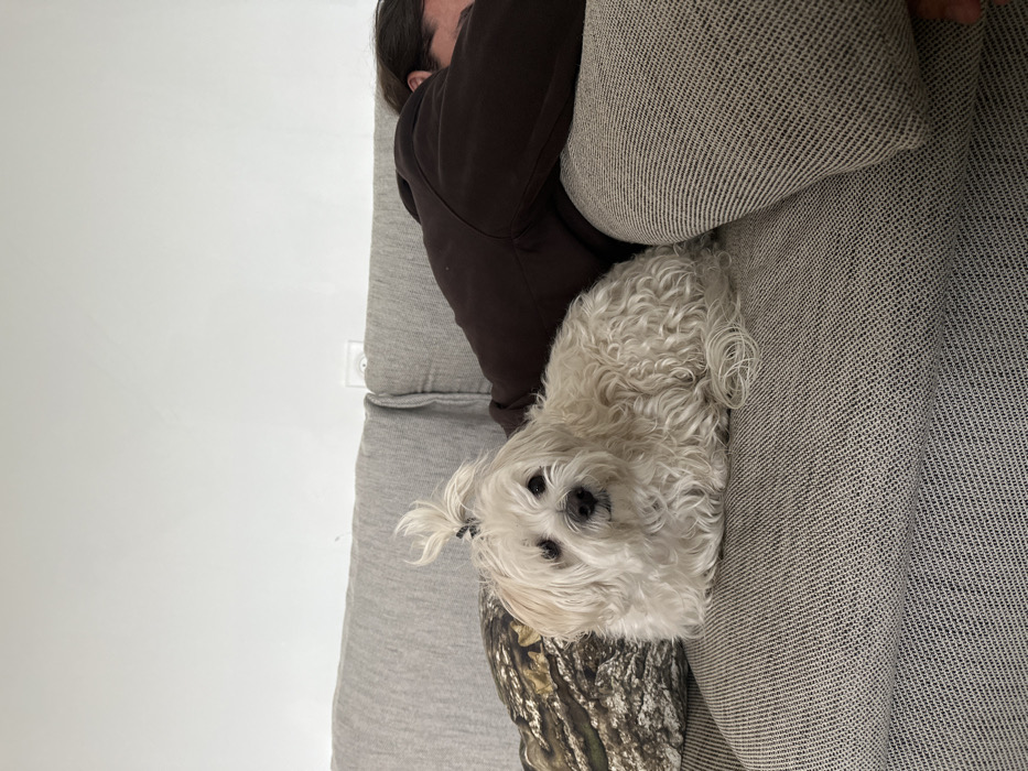 The image depicts an indoor scene with a small dog and a partially visible individual on a sofa