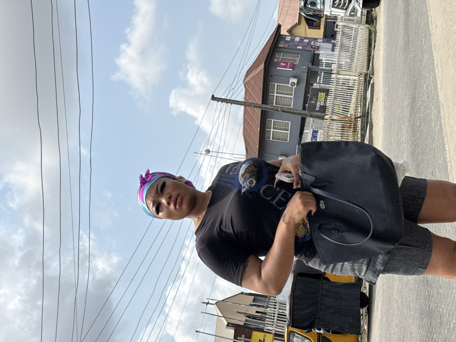 An adult female stands on a paved street or roadside in Ado, Nigeria, under a partially cloudy daytime sky