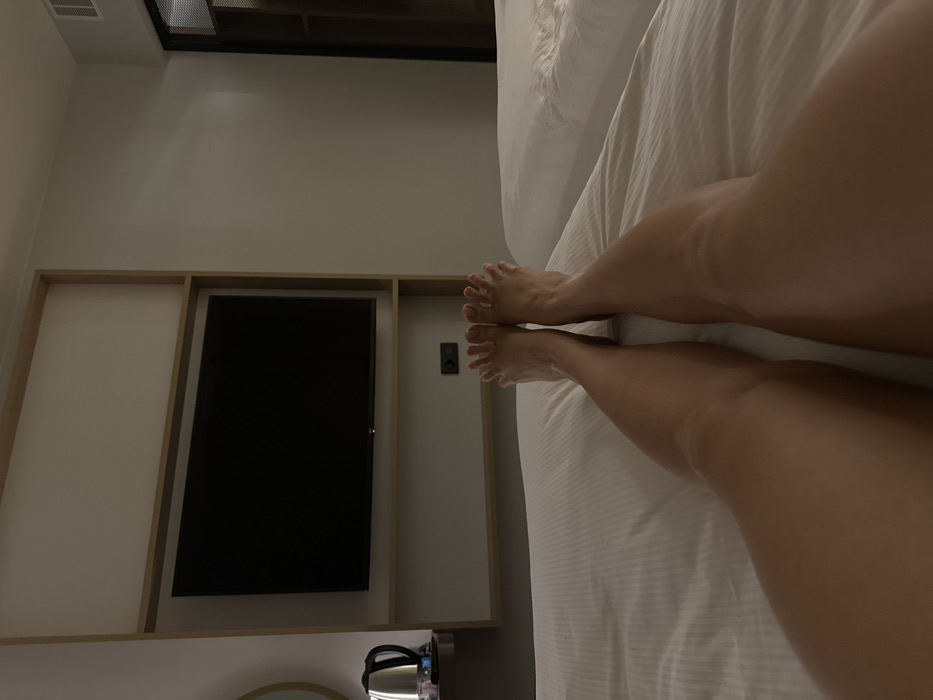 A person's legs and feet are on a white, striped bed. The legs are in the foreground and extend into the center of the frame. The bare feet are pointing up towards a flat screen television built into the wall. The room is dimly lit, and there is also an electric kettle on a cabinet nearby.