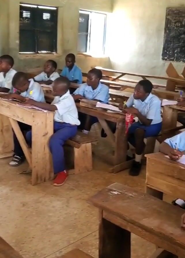 classroom filled with students. The students are wearing blue and white uniforms and sitting at wooden desks. Some are writing on paper while others are looking around. The classroom has windows, and a blackboard is visible on the wall. The overall impression is of a school classroom in session.