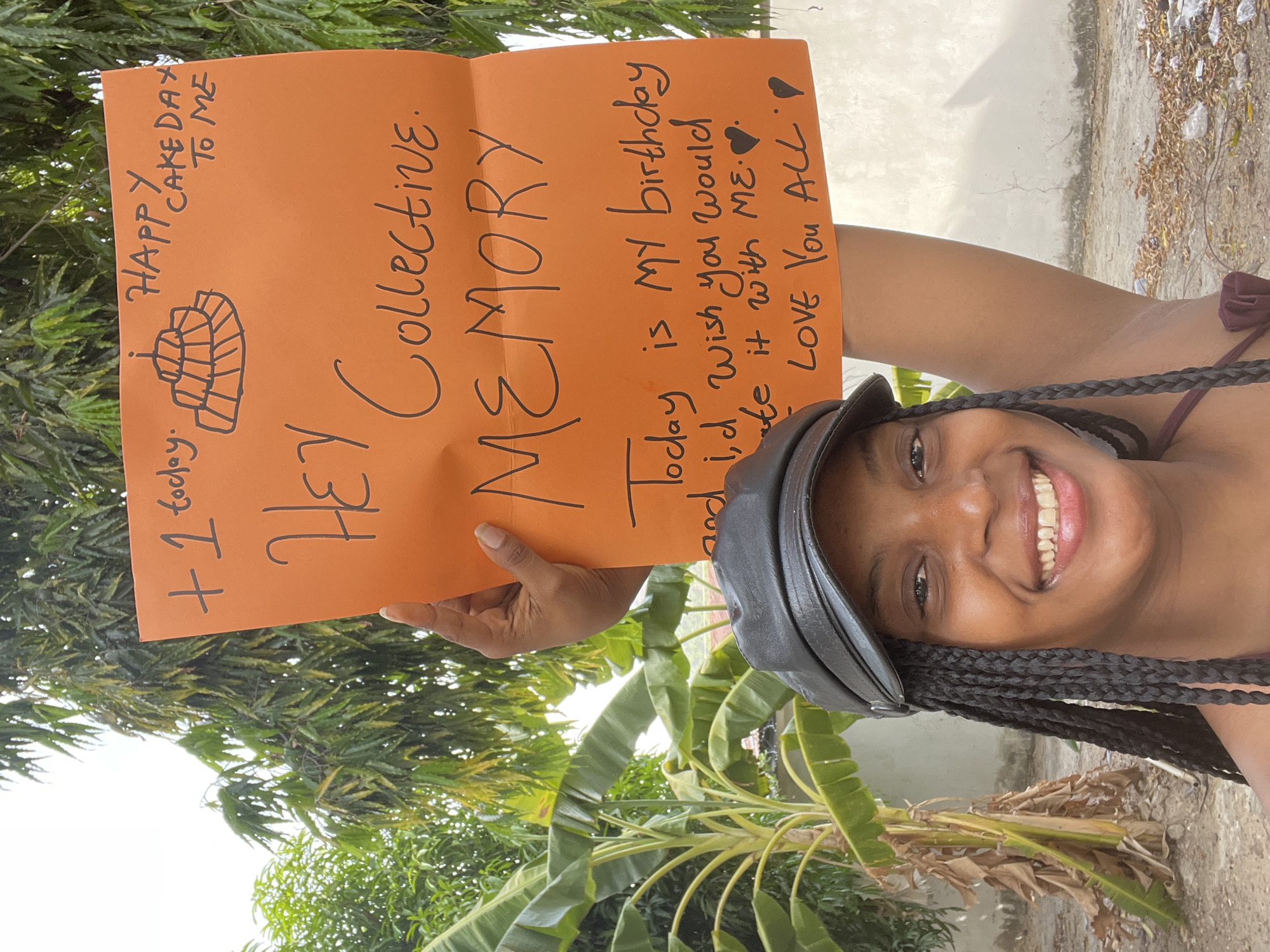 A female individual, visible from the mid-chest upwards, stands outdoors in Lokoja, Nigeria. She wears a dark cap and a dark-colored top, with her dark hair styled in braids. She is smiling, revealing her teeth. She holds aloft an orange-colored paper sign with both hands. The sign features handwritten black text: "+ 1 today. HAPPY CAKE DAY TO ME," a drawing of a multi-tiered cake with a candle, "Hey Collective. MEMORY," and "Today is my birthday and I,d Wish you would [text partially obscured by hand] it with ME. ❤️ LOVE You ALL ❤️." The background features lush green vegetation, including a large banana plant with green and dried leaves to the left, and a tall tree with dense green foliage behind the sign. To the right, a light-colored, weathered concrete or plastered wall is visible. The ground immediately behind the individual's right arm consists of dirt, scattered dry leaves, and small pieces of litter. The sky above appears bright and overcast.