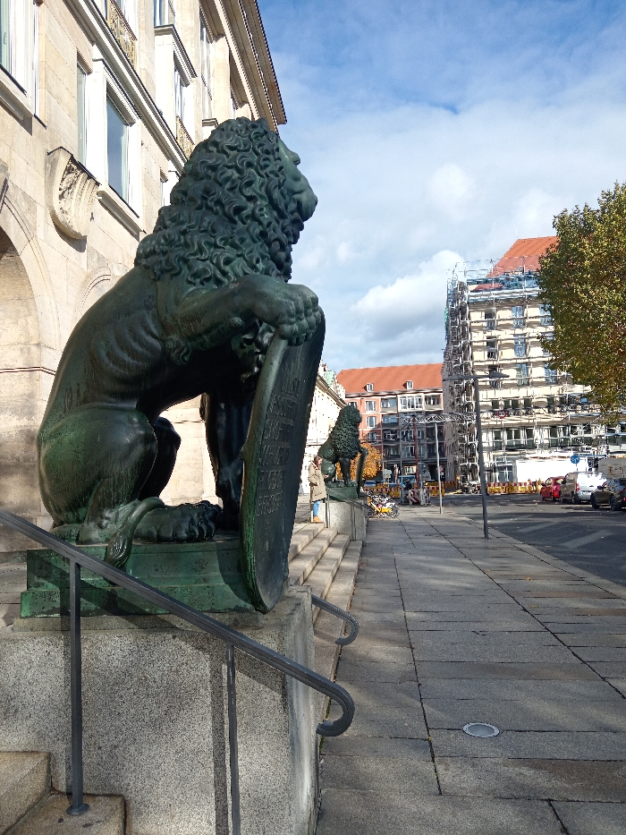 This image captures an urban street scene in front of the Landtag of Saxony (Saxon State Parliament) in Dresden, Germany, under a clear sky. In the immediate foreground-left, a large, patinated bronze lion statue rests on a granite plinth, facing right. The lion is intricately detailed, with a prominent mane, and holds an ornate shield with its front left paw. Dark metal handrails partially obstruct the bottom of the statue. Behind the primary statue, along a set of granite steps leading up to the parliament building, a second, smaller bronze lion statue in a similar pose is visible. A single individual, wearing a light-colored jacket and blue jeans, stands on the steps near the second lion, facing away from the camera towards the street. The building facade behind the lions exhibits light-colored stone architecture with arched lower sections and multiple windows. To the right of the steps, a paved pedestrian sidewalk extends into the background. Adjacent to the sidewalk is an asphalt street, where several vehicles, including red and white cars and yellow-framed bicycles, are parked or stationary. Construction barriers line parts of the street. In the midground-right, a multi-story building is entirely enveloped in white scaffolding. Further down the street, additional buildings with red-tiled roofs are discernible. A deciduous tree displaying yellow and orange autumn foliage stands on the far right. The sky overhead is bright blue with scattered white cumulus clouds, and strong sunlight illuminates the scene, creating distinct shadows.