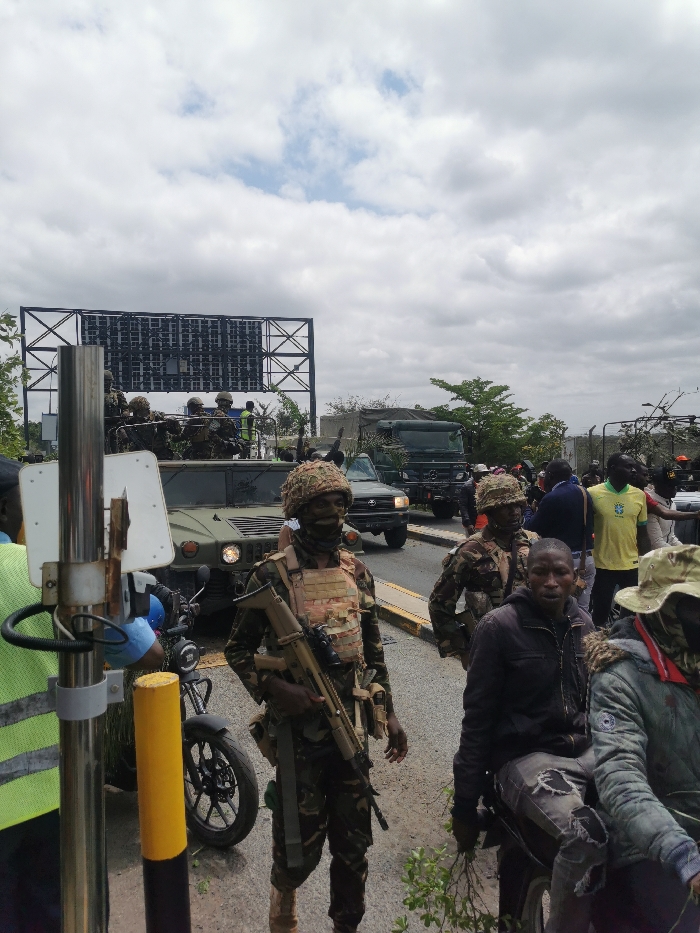 The image displays a daytime outdoor scene on a major roadway in Nairobi, Kenya, under a cloudy sky. In the foreground, a soldier in full camouflage uniform, a tactical vest, and a netting-covered helmet stands centrally, holding a tan assault rifle with an attached optic. His face is obscured by a dark mask. To his immediate right, a second soldier in similar attire, holding a rifle, is partially visible. Directly to the right of the soldiers, a civilian male wearing a dark jacket and ripped jeans is seated on a motorcycle, holding green foliage. Further right, a male in a yellow 'Brazil' soccer jersey stands among a small group of other civilians. In the mid-ground, a dark green military Humvee is positioned on the road, carrying multiple uniformed personnel, some visible in an open roof hatch. Behind the Humvee, a large dark green military transport truck and another vehicle are parked. A prominent black metal gantry structure supporting a large, unlit electronic display sign spans the width of the road in the background. On the far left, a metal pole structure and a yellow bollard are partially visible, alongside a parked black motorcycle. Scattered green trees and foliage line the roadside.