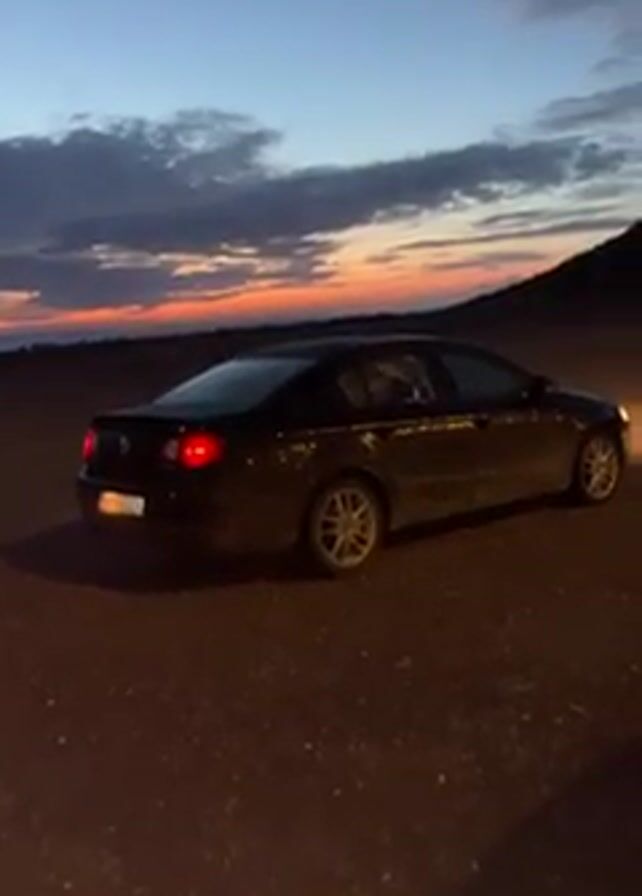 The video opens with a black car parked on a gravelly surface at dusk. The taillights are illuminated, and a faint sunset glow is visible in the sky. The camera pans to the front of the car, where headlights are on, revealing two other vehicles parked in the distance against the backdrop of a dark hill.