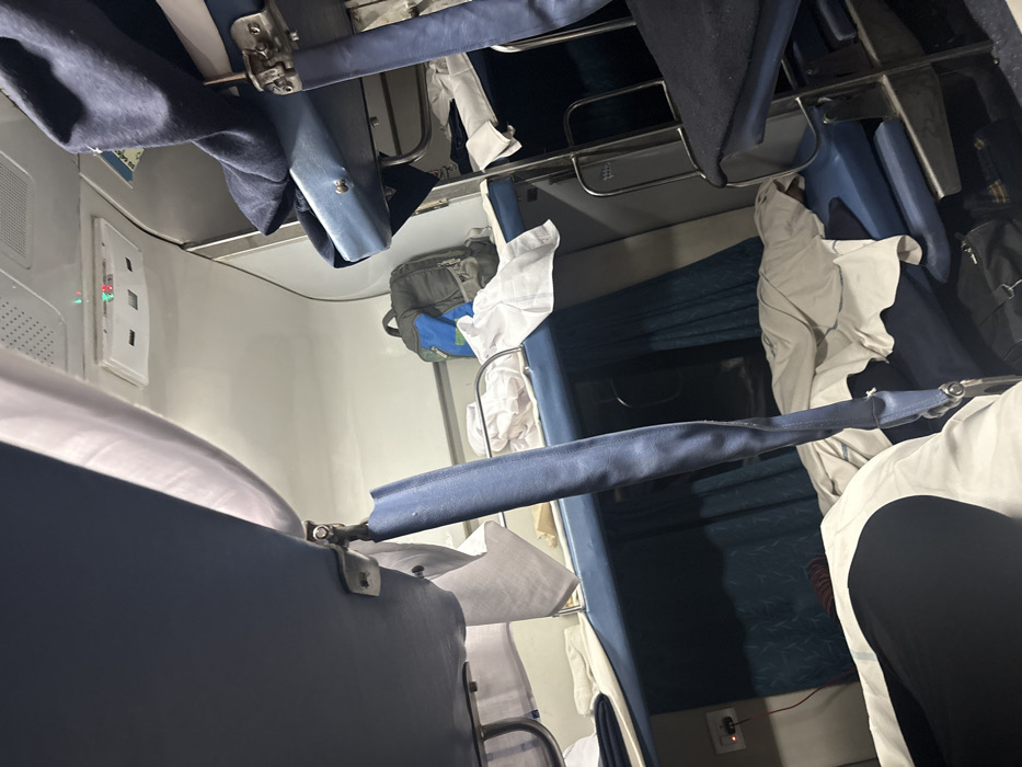 Inside a passenger train cabin, bunks lined with blue and white linens create a cluttered, cramped space