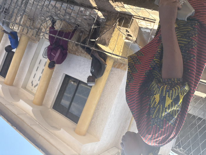 The image depicts an outdoor daytime scene in Jos, Nigeria. In the left foreground, a person is partially visible in profile, facing right. They are wearing a brightly patterned top with red, black, and yellow geometric designs, featuring puffed sleeves, and a head covering. A light-colored rectangular object is held in their left hand. A dark metal fence or railing with a geometric pattern extends across the mid-ground, separating the foreground from the background. Behind this barrier, a light-colored building with textured walls, featuring two prominent yellow-gold columns, dark-framed windows, and a white entrance door with decorative patterns, is visible. Three men are positioned in front of the building. From left to right: one man wears a dark shirt and a white kufi cap; a second man wears a maroon tunic with lighter trim and an orange cap; and a third man wears a blue t-shirt. All three men are seated or leaning against visible structures. The sky overhead is clear blue, indicating sunny conditions.