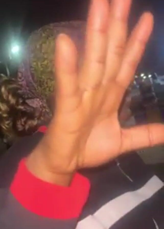 A person is outside at night, with a few lights in the background, and rows of what appears to be bottled drinks stacked up high. The person is smiling and looks directly at the camera, holds their hand up to the camera, then laughs while looking to the side, and again looks to the camera. The person is wearing a headscarf, and a black shirt or jacket with a red collar.