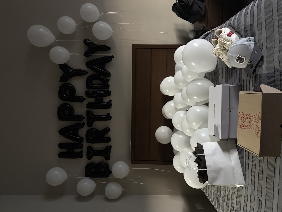 The image depicts an indoor scene set up for a birthday celebration. Black foil balloons spelling "HAPPY BIRTHDAY" are affixed to a light-colored wall above a wooden headboard. Numerous white latex balloons cover the bed, which is made with a striped grey and white duvet or comforter. Several additional white latex balloons with white strings are floating near the wall. On the bed, from left to right, are a white paper gift bag with black tissue paper, two white shoebox-style boxes (one labeled "sweet peace trade"), a brown cardboard box with a stylized illustration of a person, a pair of white sneakers with red side stripes, and a grey baseball cap featuring a black emblem. To the right of the bed, a dark-colored backpack rests on a wooden nightstand. No individuals are visible in the scene. The specific location in the city of Monterrey, Mexico, cannot be determined from the provided image.