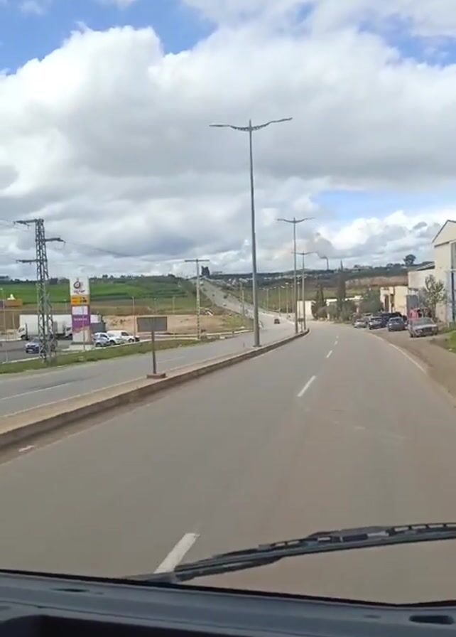 view from inside a vehicle, likely a car or truck, moving along a gray asphalt road