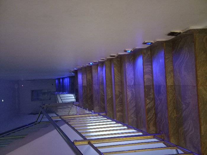 A low-angle shot reveals an interior space with a corridor leading to a well-lit area. The corridor's ceiling is white, contrasting with the patterned wall panels accentuated by downward-shining blue lights. A metal structure with white-lit surfaces extends into the corridor, possibly a ramp or platform. The structure leads toward a room with a visible window, adding depth to the space.