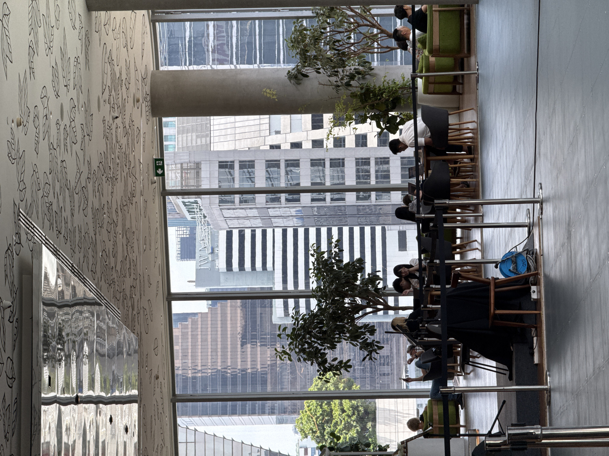 Here is a detailed description of the image: The image depicts an interior space in Bangkok, Thailand, adjacent to a large window offering a cityscape view. The interior features seating arrangements for patrons, suggesting a cafe or restaurant setting. People are observed sitting at tables, some appearing to be engaged with laptops or other devices. Decorative trees or plants are strategically placed near the windows, blending the interior space with the outdoor urban environment. The wall adjacent to the window is decorated with drawings of leaves, which adds an element of artistic touch to the place. A sign with a green arrow indicates the location of an emergency exit. Outside the window, the urban landscape of Bangkok is prominent, showcasing tall buildings with diverse architectural designs.
