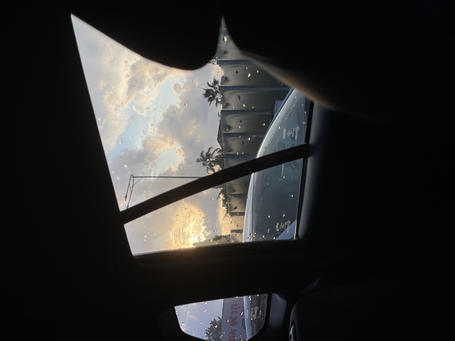The image depicts an urban roadside scene in Herzliya, Israel, viewed from inside a dark vehicle through a rain-splattered rear window. The exterior environment is illuminated by a low sun, partially obscured by dramatic cumulus clouds, suggesting either sunrise or sunset. Directly outside the vehicle's window, a dark-colored Toyota vehicle is partially visible in an adjacent lane, its rear window displaying discernible Hebrew text that includes "חזרה או". In the midground, a tall, multi-paneled grey barrier, possibly a sound wall or retaining wall, is prominent. Several palm trees are visible above and behind this structure, silhouetted against the sky, along with a street lamp post featuring a horizontal crossbar. No individuals or active interactions are explicitly identifiable within the frame.