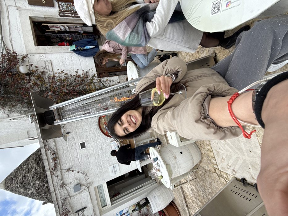 This image captures an outdoor commercial establishment in Alberobello, Italy, featuring a distinctive white trullo building with a conical stone roof in the upper left background. In the immediate foreground, a female subject with long dark hair is smiling towards the camera. She wears a light beige puffer jacket and grey trousers. Her left hand holds a stemmed glass containing a light-yellow liquid, likely white wine. A red string bracelet is visible on her right wrist, which is extended towards the camera. Her fingernails are painted light pink. To the right of the primary subject, another female is partially visible, seated, wearing a light grey coat, black hosiery, and black boots. A multicolored scarf (purple, grey, white) is draped over her shoulder. Further into the scene, a third female, wearing a pink jacket and blue jeans, is seated at a table, seemingly focused on an object in her hands. To the left, a male subject is seen from the back, wearing a black shirt and blue jeans, standing near a white counter with two wine barrels repurposed as tables. The environment includes white-washed stone buildings. A sign near the trullo entrance reads "RECEPTION," while another sign above a counter states "Wine Bar." A street sign with "VIA D'ANNUNZIO, 5" and "PIAZZA XX SETTEMBRE" is affixed to a building facade. A tall, stainless steel outdoor patio heater with a visible flame is positioned centrally. The ground is paved with light-colored stones, some exhibiting carved patterns. Reddish-brown climbing vines are present on the building wall to the right. An open shop entrance, displaying various merchandise, is also visible on the right.