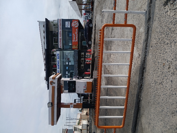 gas station in Way, Nigeria, located at latitude: 6.429, longitude: 3.468. The scene is a gas station with a closed gate. The gas station is a concrete structure with a canopy over the pumps. There are three pumps, two of which are visible. The pumps are marked with the text "RIT SANITARY WAPE AUTHORISED NIGERIA DISTRIBUTOR" and "Sweet Sensation". There are no people in the scene, but there is a parked black car in front of the gas station. There are orange and white metal barricades extending from the pumps to the opposite side of the driveway. The ground is gray and paved. The sky is a bright overcast grey. The image was taken during the day. The image was taken in a horizontal orientation. The image is likely taken from a slightly elevated angle.