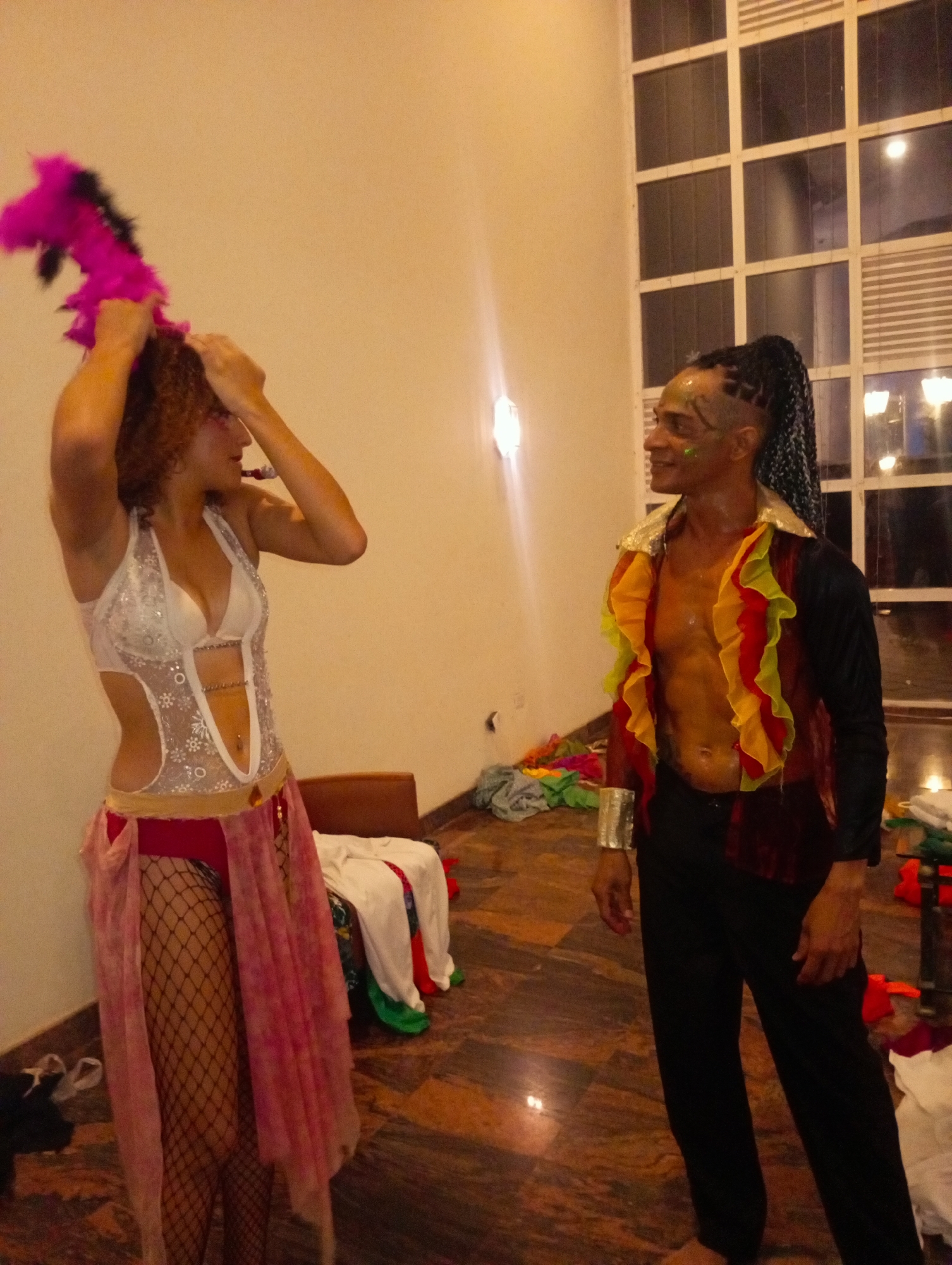 two individuals indoors in what appears to be a dressing room. The woman on the left, facing forward, is holding a pink feather headdress and wearing a white, open-sided top with a bra visible, a red undergarment, fishnet stockings, and a pink sheer skirt. The man on the right, facing the woman, is shirtless with a black shirt with yellow and red ruffles over it, black pants, and braided hair pulled back into a ponytail. He has paint on his face. The room has a light wall and a large window with multiple panes. There are piles of fabric on the floor. The image was taken in Pedro González, Venezuela.