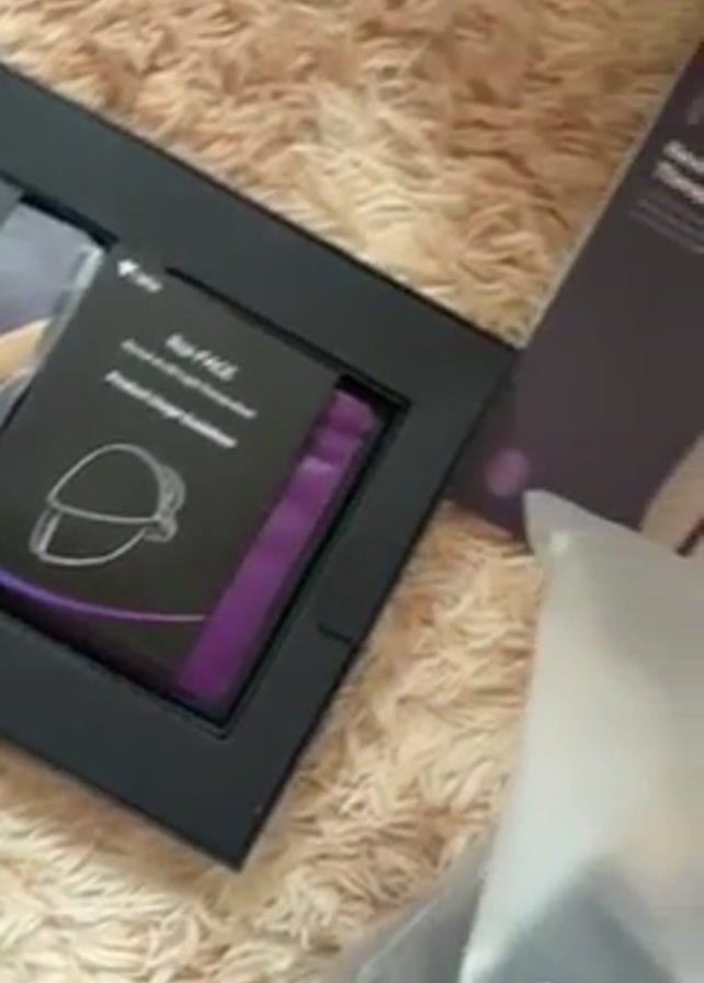 collection of items related to a "Rai-FACE Revival AI LED Light Therapy Mask". The items are placed on a tan, plush carpet or rug. There is a black box with a section that displays a purple cloth and a product usage guide booklet. Next to the box is the product's packaging box, which is purple and features a picture of the mask. To the right of the product box, there's a semi-transparent plastic bag labeled "Rai-FACE", which presumably contains the mask itself. The overall arrangement indicates that the products are either being unboxed or displayed.