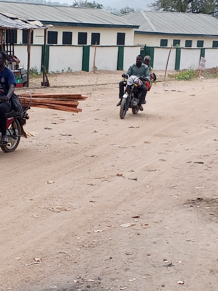The image depicts an unpaved dirt road in Otokiti, Nigeria, under daylight conditions. The foreground consists of light brown earth with visible tire tracks and scattered light-colored debris. Two motorcycles are in motion, traveling from left to right across the frame. On the left, a red motorcycle, partially visible, carries a substantial bundle of light-brown wooden planks secured across its rear seat with white ties. The operator, a dark-skinned male, is wearing a dark blue shirt with a light emblem on the left chest and black flip-flops. To the right, a second, predominantly silver and dark-colored motorcycle is operated by a dark-skinned male wearing a light green long-sleeved shirt and dark trousers. A dark-skinned female passenger, wearing a colorful patterned top, rides directly behind him. In the mid-ground, a long, white single-story building with a gray corrugated metal roof serves as the primary background structure. It features multiple dark rectangular windows and a continuous dark green trim band along its lower wall, punctuated by vertical dark green posts. A rudimentary market stall structure with a dark roof and wooden supports is partially visible on the far left. Distant hills or mountains are discernible on the horizon behind the building. A small white sign with red lettering is visible on the far right of the scene.