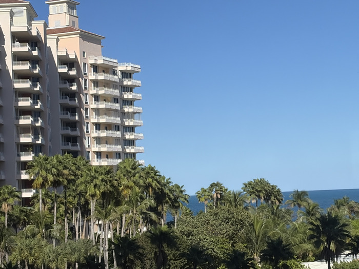 This image depicts an outdoor scene in Key Biscayne, United States of America, under clear daylight conditions. A prominent, multi-story building with a light peach-colored exterior and red-tiled roof accents dominates the left side of the frame. This structure features numerous white-railed balconies on each level, extending from various sections of the facade. Several tall, green palm trees are densely distributed across the foreground and midground, partially obscuring the lower levels of the building and extending towards the right. Beyond the treeline, a calm body of blue water, identified as the ocean, is visible on the right horizon. The upper half and right portion of the image are occupied by a clear, cloudless blue sky. No individuals or specific actions are discernible.