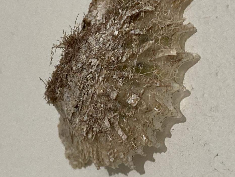 A close-up photographic detail captures a single, irregularly shaped bivalve shell, consistent with an oyster, resting on a flat, plain, light-colored surface. The shell exhibits a rough, layered texture with prominent, undulating ridges along its lower left edge. Its surface is predominantly light brown and off-white, heavily encrusted with a dense layer of fine, dark brown, fibrous marine growth, resembling dried algae or hydroids, particularly concentrated on its upper and central regions. Scattered lighter-colored debris or biological deposits are also visible on the shell's surface. A distinct shadow is cast beneath and to the left of the specimen, indicating illumination from the upper right. The immediate background is featureless, offering no specific environmental cues to determine the exact location within Palma de Mallorca, Spain. There are no people, actions, or interactions depicted.