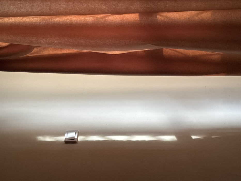 The scene is an interior view located in Plovdiv, Bulgaria. A light-toned, likely beige or off-white, wall occupies the left two-thirds of the frame. A rectangular light switch, off-white or light gray, is horizontally mounted on this wall in the upper-left quadrant. A vertical, irregular column of direct sunlight illuminates the wall, passing near and below the light switch. The right one-third of the image displays a heavily draped curtain of reddish-orange or rust-colored fabric, which exhibits prominent folds and texture. Natural sunlight casts distinct patterns of illumination and shadow across both the wall and the curtain. No individuals or active subjects are present.