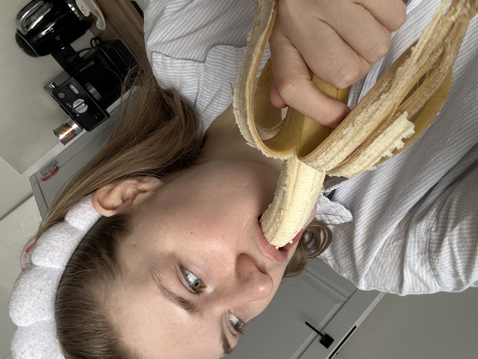 - "A fair-skinned person is shown at an oblique angle, biting into a peeled banana" by FM-iSKVh2, licensed under CC BY 4.0
