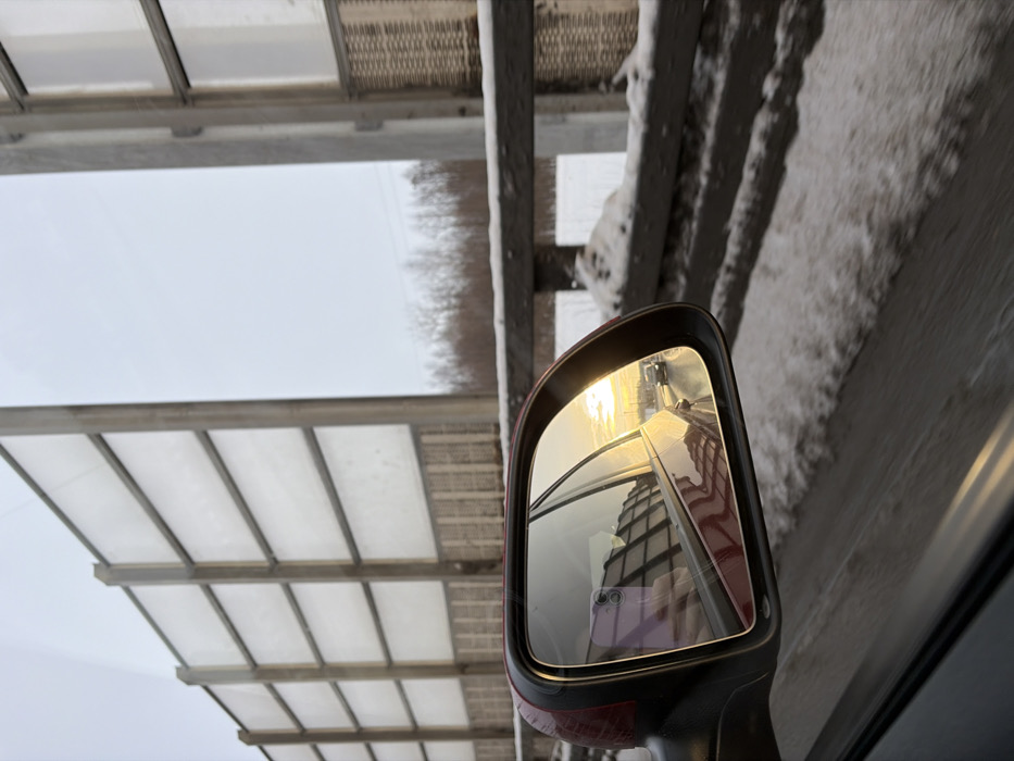 The image depicts a scene captured from within a moving red passenger vehicle on the Kronstadt Ring Road in Kronstadt, Russia, during a winter or late autumn day. In the foreground, the dark frame of the car door and the red casing of the side-view mirror are prominent. The side-view mirror reflects a low-angled sun, appearing as a bright yellow-orange glare on its right side, along with two light-colored vehicles traveling on a wet multi-lane road in the distance behind the camera's position. A purple-cased smartphone with a dual-camera lens, held by the photographer, is also visible as a reflection within the mirror. Outside the vehicle, a tall sound barrier wall runs parallel to the road, composed of light-colored, rectangular translucent panels supported by dark vertical pillars. Below the sound barrier, a dark guardrail, partially covered in snow, extends along the roadside. The ground adjacent to the road is covered in patches of snow and dark, possibly wet, earth. Beyond the sound barrier, a line of bare deciduous trees is visible against an overcast, light grey sky. The road surface immediately outside the vehicle appears dark and wet, with accumulated snow and slush along the shoulder.