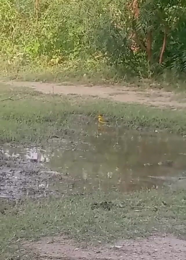 small, yellow bird hopping around in a puddle of water. The puddle is in a grassy area next to a dirt road. There are trees and bushes in the background. The bird hops around in the puddle a few times.
