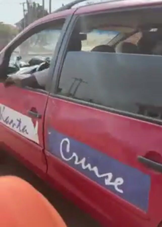 red minivan with the word "Family" written on its side, parked on a street with its trunk open. The camera then pans to the right, showing the side of a red car and the road. In the background, there are people walking on a dirt area next to the road. The video is taken from inside a vehicle, likely the minivan.