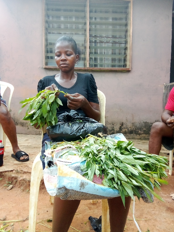 An adult woman is depicted outdoors, seated on a light-colored plastic chair, meticulously picking green leaves from a plant stem. She wears a black short-sleeved top with ruched shoulders and dark lower garments. On her lap, supported by another light-colored plastic chair, rests a colorful patterned bag holding a large pile of similar green leafy vegetables and a black plastic bag. To the viewer's left, the lower legs and a black slide sandal of another individual are visible, also seated, with a red Coca-Cola bottle on the ground nearby. To the viewer's right, the lower torso and legs of a third person, wearing a red shirt and dark shorts, are partially visible, engaged in an unseen manual task. The background features a light brown wall with two rectangular windows equipped with horizontal louvre-style blinds. The ground is reddish-brown, unpaved earth with scattered green leaves and debris. This scene is situated in a non-specific outdoor area within the city of Lagos, Nigeria.