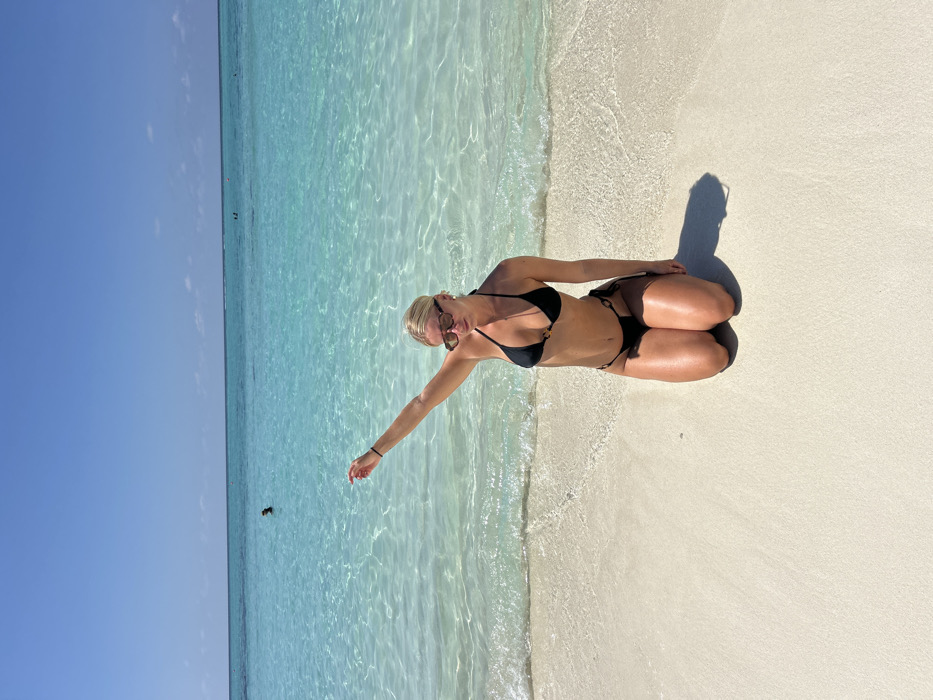 A woman in a black bikini kneels on a white sandy beach, with clear turquoise water to her left