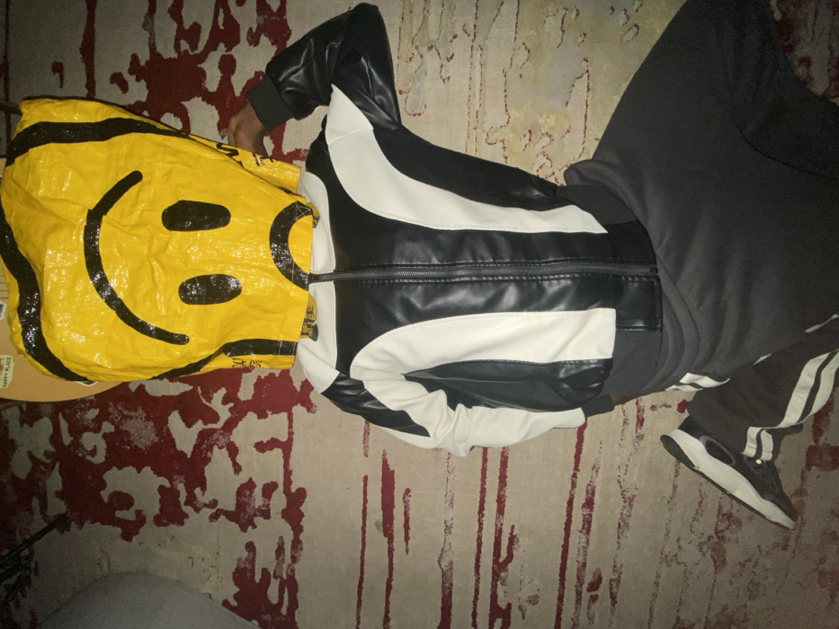 A person lies on a patterned rug. Their head is covered by a yellow bag with a black smiley face. They wear a black-and-white leather jacket, a grey hoodie, and dark grey sweatpants. One leg is extended, with a black and white shoe visible. The rug has a beige background with red patterns, possibly depicting stains or abstract designs. The lighting appears dim, casting shadows across the scene.