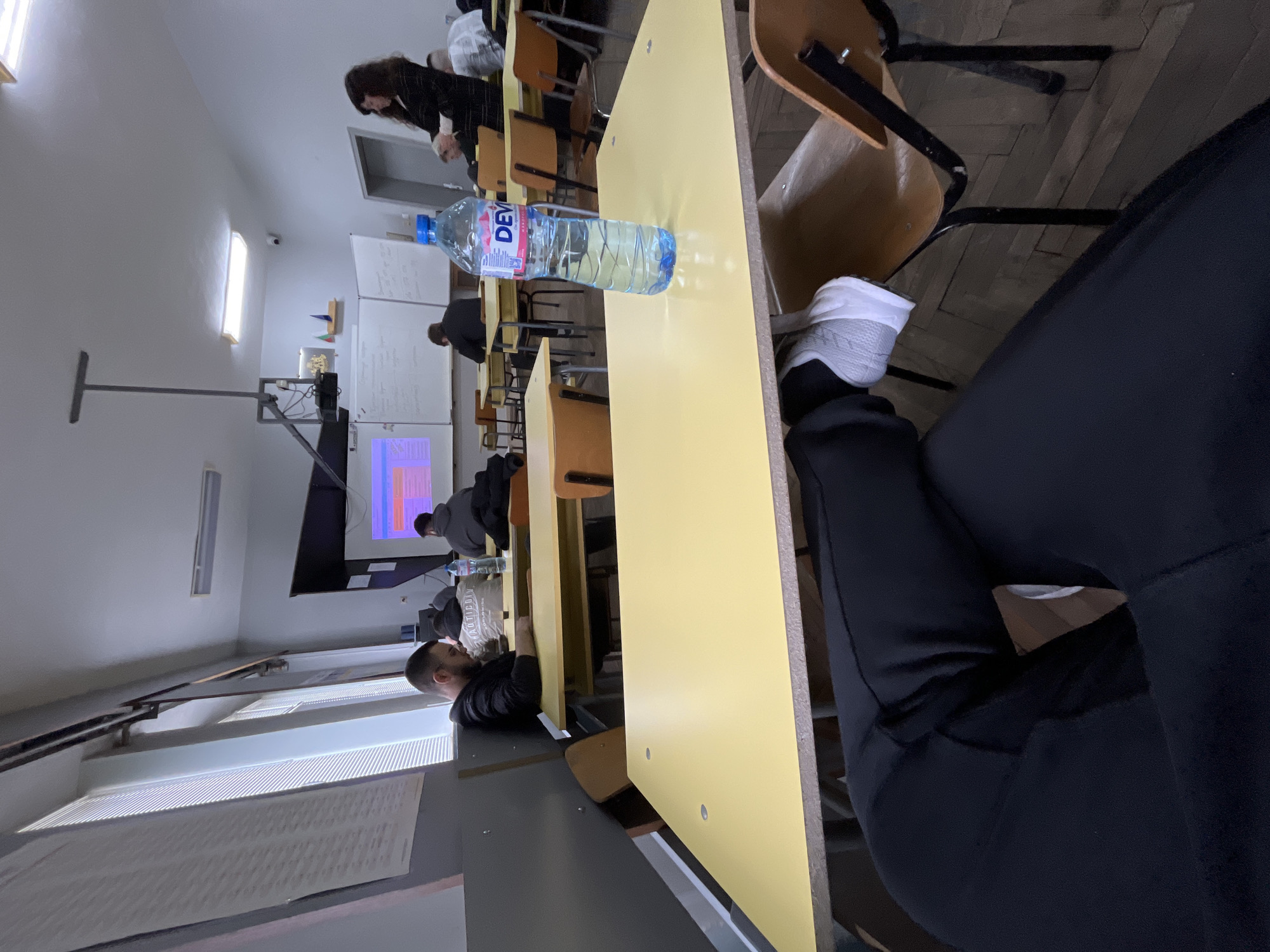 n indoor scene in what appears to be a classroom in Shumen, Bulgaria. Desks with yellow tops are arranged in rows. A bottle of "Devin" water is on one of the desks. A person wearing black clothing and white shoes has their legs positioned on a desk. Other individuals are visible in the background, some seated and facing a projection screen. Windows are visible on the left side of the frame.