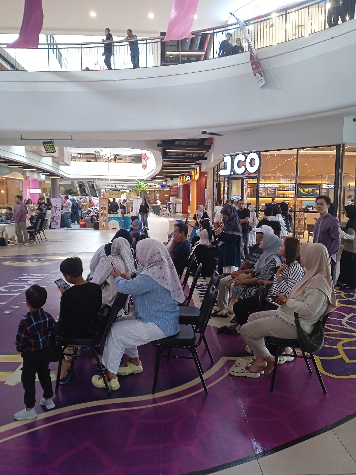 The image depicts a multi-level indoor shopping mall in Semarang, Indonesia. The ground level features a large purple floor covering with yellow patterned accents. Approximately ten individuals are seated on black chairs in the foreground, facing generally forward or slightly right, on this purple flooring. A woman in a light blue striped shirt, white pants, and a light blue patterned hijab is seated, actively using a smartphone. To her left, a young boy in a black shirt is also seated, observing a smartphone. Standing to the left of the seated boy is a younger boy in a plaid shirt and dark pants. Another woman, dressed in a beige top, pants, and matching hijab, is seated further right. In the mid-ground, to the left, several temporary market stalls are visible with merchandise displayed on tables, accompanied by individuals browsing and interacting. An escalator system connects the lower levels in the background. On the right, a prominent "J.CO" donut and coffee shop storefront is visible. On the upper levels, multiple individuals are standing along the white curved balconies with black railings, observing the activity below. Pink fabric drapes are suspended from the upper railings, along with a partially visible banner. The environment is brightly lit, suggesting a general daytime or well-lit interior setting.