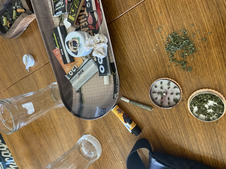 A wooden table contains drug paraphernalia. A rolling tray holds rolling papers, a container, and other items. Scattered marijuana sits next to a grinder containing more marijuana. A rolled joint and a lighter are also present. In the background, there is an ashtray with cigarette butts, along with two glass bottles.