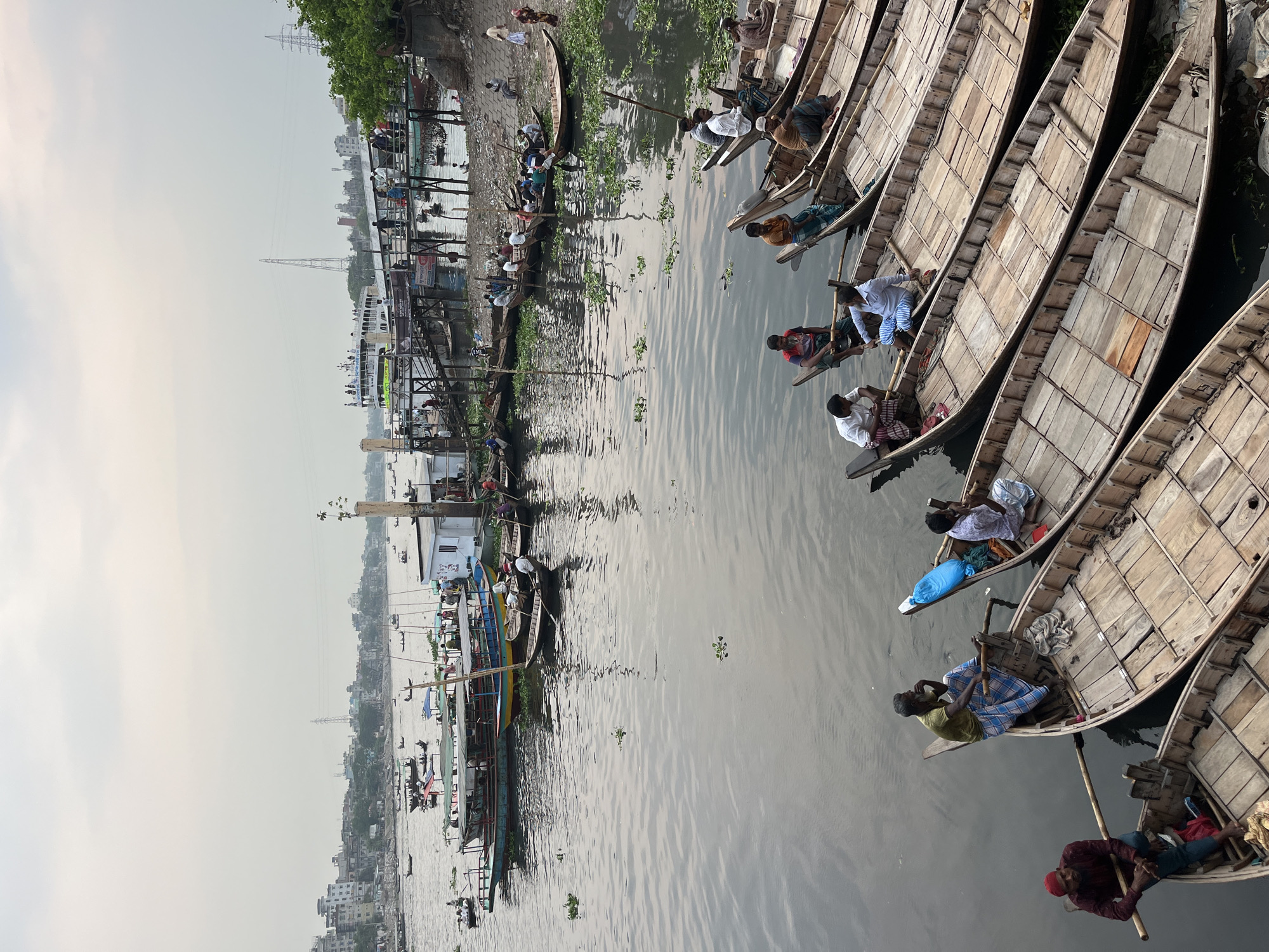 The image depicts a waterway scene in Dhaka, Bangladesh. Numerous narrow, wooden boats are lined up along the shore, many containing individuals relaxing or sitting. Some individuals hold long poles, possibly for propelling the boats. The water is grey and somewhat murky. Along the shore, there is dense vegetation and structures, indicating urban development. In the background, buildings and utility towers are visible in the cityscape under a hazy sky.