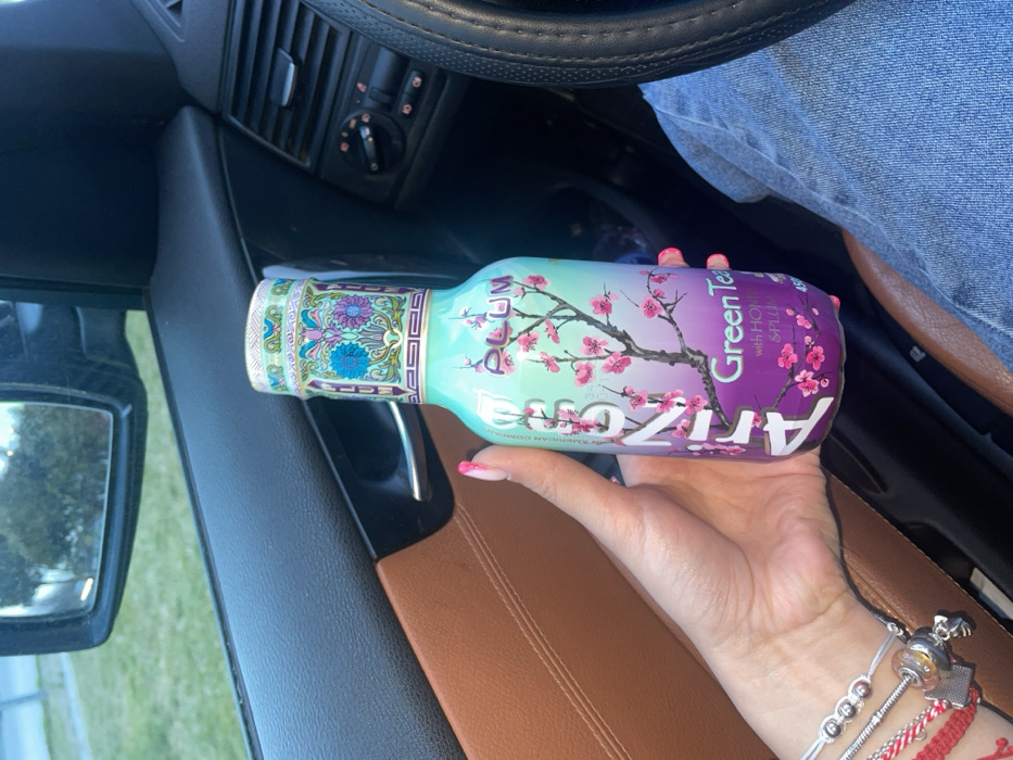 A human hand, with pink-tipped fingernails, is holding an Arizona Green Tea with Honey & Plum beverage in a 450ml bottle. The bottle features a label depicting a cherry blossom tree on a teal and purple gradient, topped with an intricately patterned cap. The hand wears multiple bracelets, including silver beaded ones with charms (a star and another small charm) and red and white string bracelets, one appearing to be a Martenitsa. The scene is inside a vehicle. The car interior features a brown (tan) leather door panel with a black upper section and a silver door handle on the left. Part of a black steering wheel is visible on the right, along with dashboard controls. The person's leg, visible below the bottle, is covered in blue denim. Through the side mirror on the left, an outdoor environment with green grass and a paved surface is reflected under a bright sky. The exact location within Kalugerovo, Bulgaria, is not discernible from the image, but the scene is situated inside a vehicle.