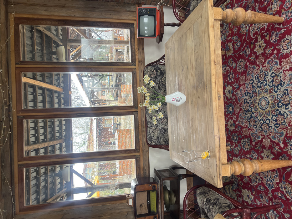The image depicts an indoor scene in Argveta, Georgia, looking outwards through a large, four-pane wooden-framed window during what appears to be light snowfall or rain. The interior features a central rustic wooden table with large, turned legs, resting on a predominantly red, blue, and gold patterned rug. On the table, a tall, clear glass contains ice and a lemon wedge, positioned to the left. A white ceramic vase with a red floral design holds a bouquet of yellow and white daffodils, located slightly to the right of the glass. To the left of the table, a dark wooden side table holds a vintage brown radio on its top surface and a brass-colored bowl on a lower shelf. To the right of the table, a small, dark wooden pedestal table supports a retro-style orange television set with a black screen. Sections of patterned seating with dark floral upholstery and reddish-brown frames are visible in the foreground and directly behind the central table. String lights are strung along the interior top edge of the window frame. Through the window, an outdoor patio or garden area is visible, featuring several open-sided structures with dark, possibly corrugated roofs supported by wooden beams and posts. Brick planters or low walls are present throughout the outdoor space, and various outdoor tables and chairs are discernible under the covered areas. Bare trees are visible in the background, and the ground appears wet. No individuals are present in the scene.