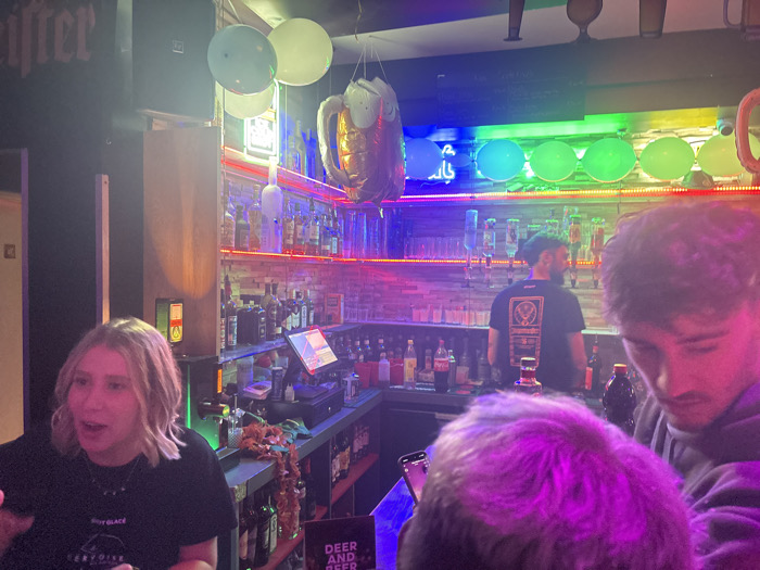 The image portrays an interior scene within "Le Drifter," a bar located in Sélestat, France. The environment is characterized by dim ambient lighting accentuated by vibrant multi-colored LED and neon light strips, creating a dynamic atmosphere. In the foreground and midground on the left, a blonde female with shoulder-length hair, wearing a black t-shirt, is depicted mid-conversation, her mouth open and left arm raised in a gesture. Adjacent to her on the bar counter is a green and black Jägermeister tap machine. Above and behind her, a large dark speaker is mounted on a black wall bearing the faded, dark lettering "Drifter." The central and right portions of the image feature a fully stocked bar counter. Behind the counter, a male bartender with dark hair and a beard stands, facing towards the right, wearing a black t-shirt with a white Jägermeister logo on the back. Above the bar are three tiers of shelves filled with various liquor bottles, illuminated by red and purple LED strips. Above these shelves, a horizontal rainbow-colored LED strip runs beneath five green-lit circular fixtures and a partially visible neon sign displaying Arabic script. Hanging from the ceiling are several balloons, including a large, golden, inflatable beer mug balloon centrally located, and lighter-colored balloons (white and pale green) to the left. An electronic tablet, likely a point-of-sale system, rests on the bar counter to the right of the bartender. An orange-brown leafy garland is draped across the counter. In the immediate foreground, the back of a person's head, illuminated with purple light, obscures part of the scene. This individual is holding a mobile phone, whose screen is visible. To the right, a male patron with dark hair and facial stubble is looking downwards, seemingly at the phone screen, wearing a dark top. A small sign on the lower right section of the bar counter reads "DEER AND BEER." The scene depicts a lively social setting within a nightclub or pub.