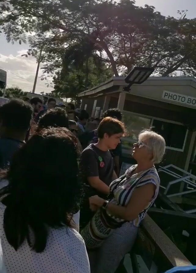 Here is a brief description of the video: The video shows a crowded area, likely a tourist attraction. A group of people are gathered near a structure labeled "PHOTO BOOTH". A young man is talking to an older woman wearing sunglasses and a striped shirt. The camera pans to show a view of a body of water with several airboats docked at a wooden pier. There are tall grasses and trees lining the shore. The sky is blue with scattered clouds.