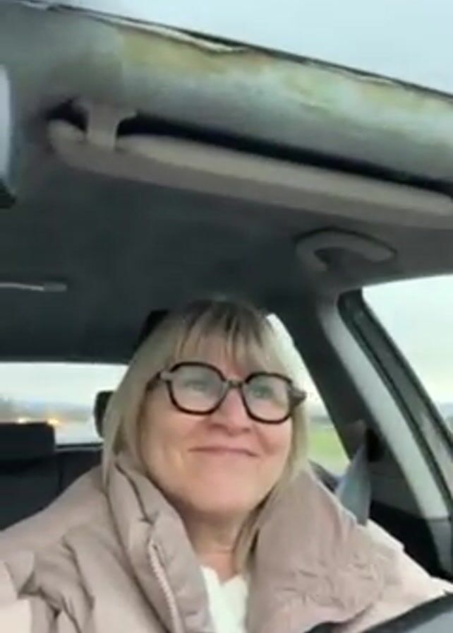 A woman wearing glasses and a tan puffer jacket is sitting in the driver's seat of a car. She looks directly at the camera and opens her mouth slightly. The car appears to be in motion, with a road visible in the background. The interior of the car shows wear and tear, particularly on the ceiling.