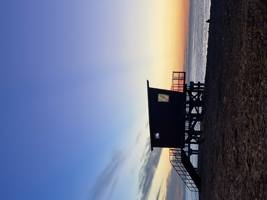 This image depicts a coastal scene in Batumi, Georgia, at either sunrise or sunset. The sky transitions from deep blue at the top, fading to lighter blue, then yellow, orange, and red near the horizon, with subtle, elongated clouds in the upper left. A dark, silhouetted structure, resembling an elevated hut or lifeguard station, dominates the middle ground. This building is supported by multiple stilts and features an asymmetrical roof sloping downwards to the right. A set of stairs with handrails ascends to the left side of the structure from the foreground's pebble beach. A small, rectangular window on the left side of the building exhibits a faint internal light, while another window on the right has vertical slats. A small balcony with railings extends from the right side of the structure, with the intense orange-red glow of the sun visible through its railings and above the distant, calm Black Sea. The foreground consists of a dark pebble beach. A solitary, dark silhouette of a person is seated on the beach at the far right, near the water's edge, holding what appears to be a fishing rod, facing the sea.