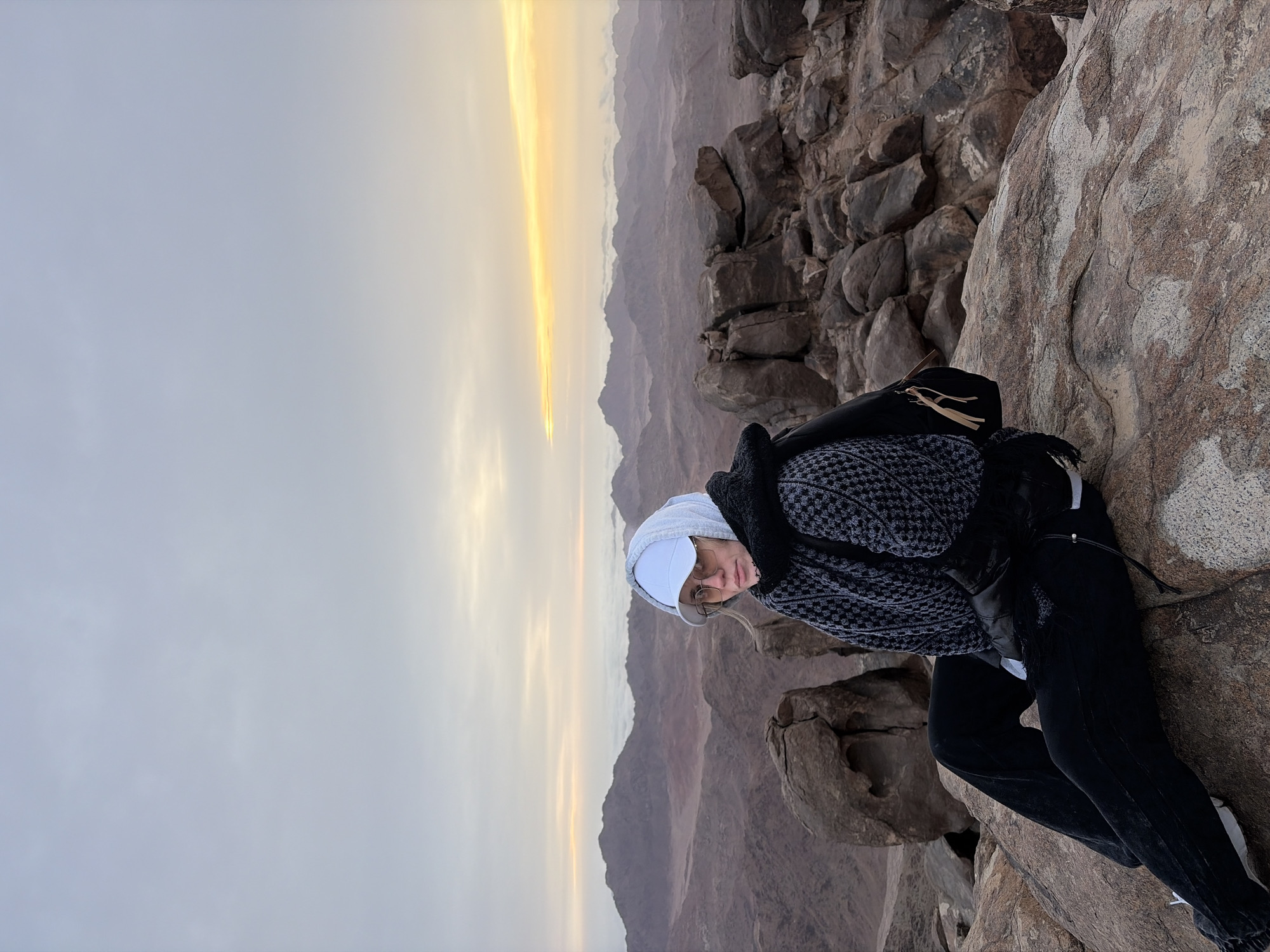 A young woman stands on a rocky outcrop in Saint Catherine, Egypt. She is wearing a white beanie, a gray sweater, and dark pants. The landscape behind her is mountainous, with a golden sky suggesting sunrise or sunset.