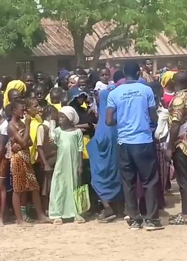 A crowd of people of various ages, predominantly young people, stand and sit in an outdoor area. Many are dressed in brightly colored clothing. A man in a blue shirt stands in the middle of the crowd. Trees and a building are visible in the background. The ground is bare and dusty. The crowd appears to be gathering or waiting for something.