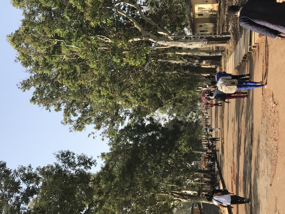 This image depicts a busy, unpaved avenue in Rafin Par, Nigeria, under a clear, bright blue sky. The reddish-brown dirt road, showing visible potholes and uneven sections, extends into the distant background, flanked on both sides by tall trees with dense green foliage, some displaying light-colored, peeling bark. Overhead power lines are visible strung across the street. Numerous individuals, estimated between 20-30 clearly visible, are walking along the thoroughfare. Most are seen from behind, moving away from the camera, wearing casual clothing. Several individuals carry backpacks. In the foreground, on the right, a person in a dark jacket walks away from the viewer. Further up the road, a group of four individuals, one with a light-colored backpack, walks together on the right side of the road, near a raised, concrete-like walkway. On the right side of the road, a street light pole stands, and behind it, a row of single-story, light-colored buildings with brown roofs is visible. On the left side of the road, various indistinct structures, some possibly market stalls with colorful awnings (including a red one), are present, surrounded by clusters of people. The scene is illuminated by strong daylight, casting shadows from the trees and pedestrians onto the road.