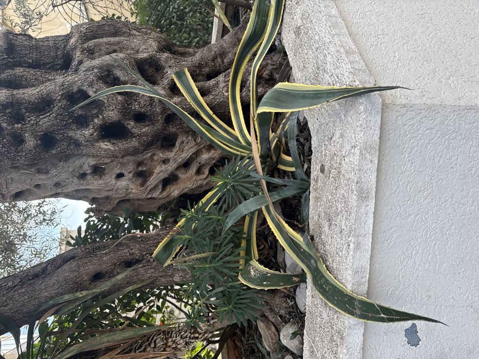 The image displays a close-up, ground-level view of a stone or concrete planter situated in Petrovac na Moru, Montenegro. The planter holds several plant species, notably two mature trees with thick, gnarled, and deeply fissured bark, characteristic of ancient olive trees. The trunk on the right exhibits multiple hollows. In the foreground, a large variegated agave-like plant features broad, sword-shaped leaves with prominent green centers and bright yellow margins, some leaves extending over the planter's textured edge. Smaller dark green plants with radiating leaves, possibly spurge, are visible at the base of the trees, one bearing a slender upright stalk. A segment of a dried palm frond is present on the far left. The visible soil within the planter contains scattered light-colored pebbles. The background reveals additional green foliage, sections of light-colored building structures, and a distant, vague architectural feature against a bright, hazy sky. No individuals or animals are visible.